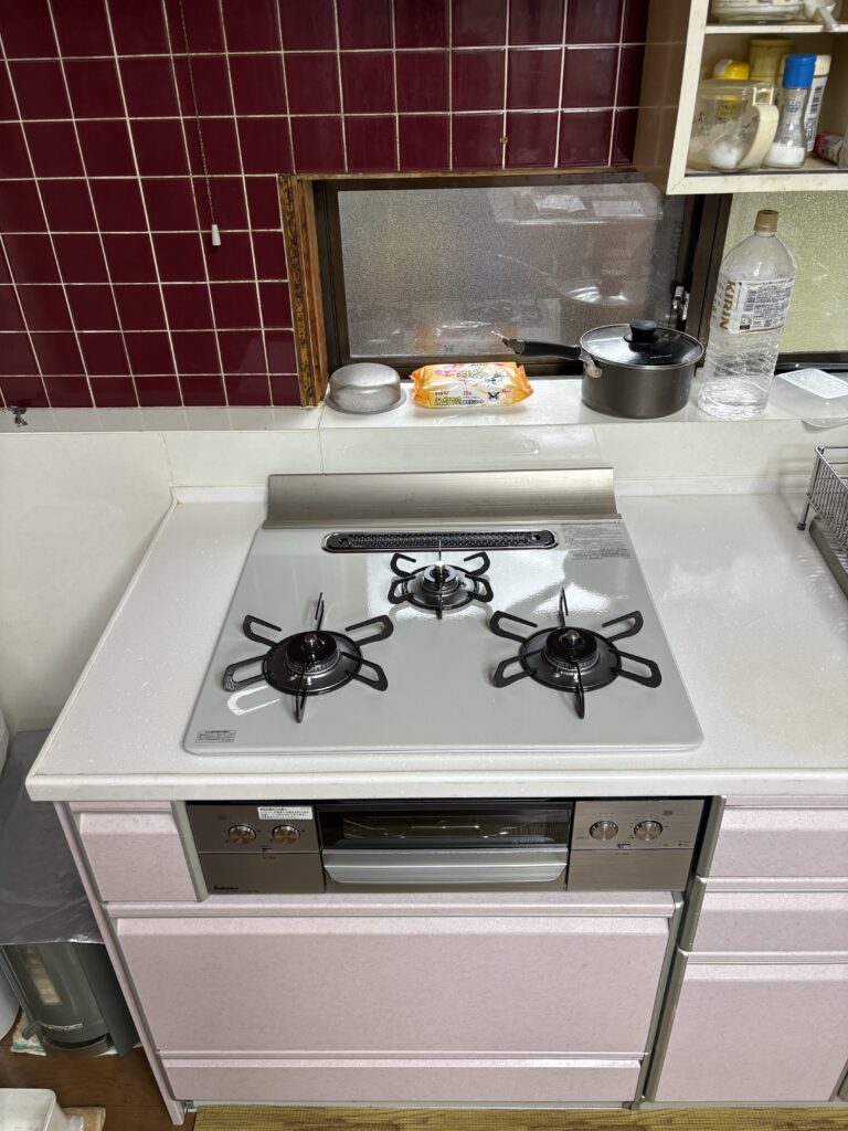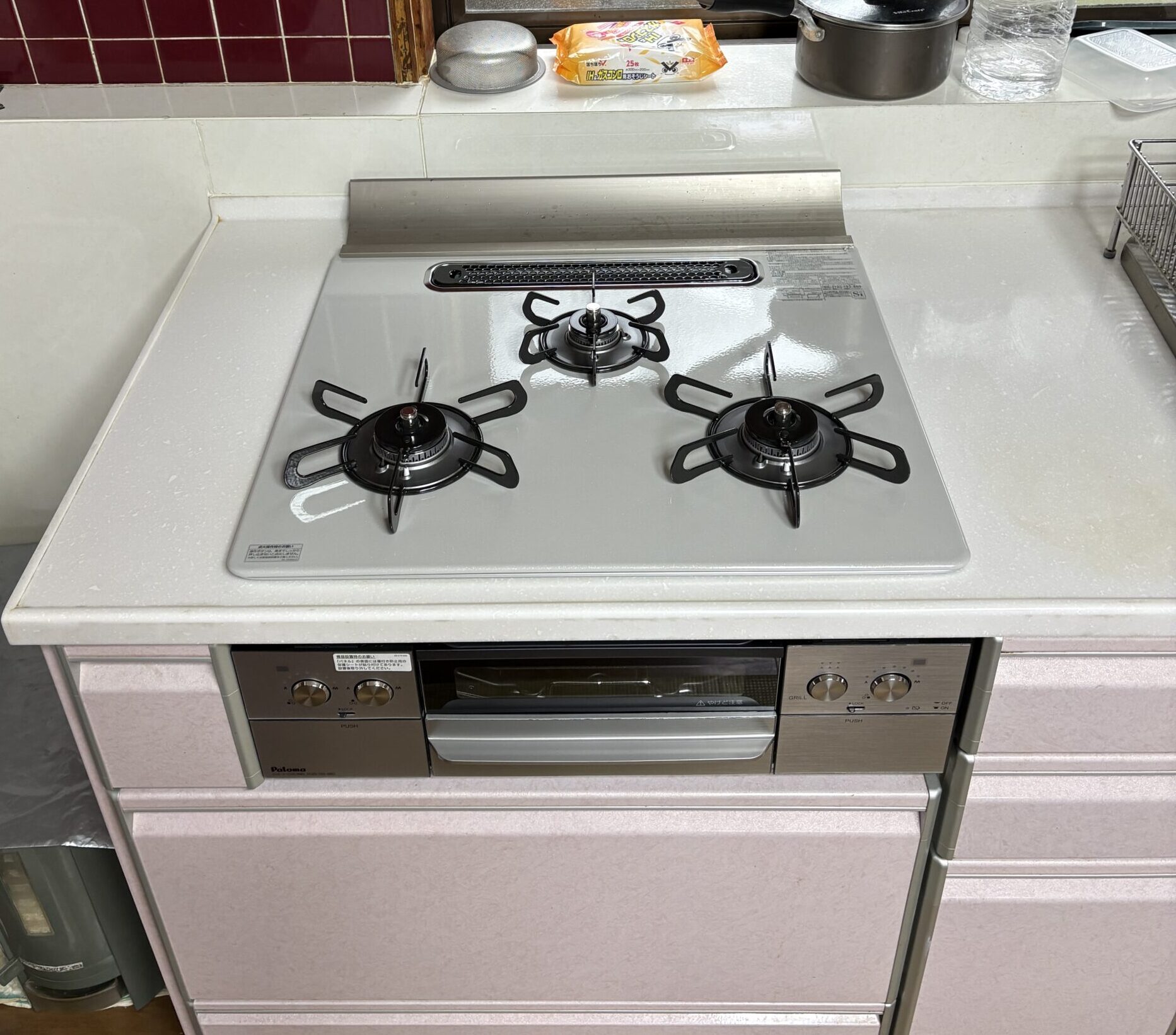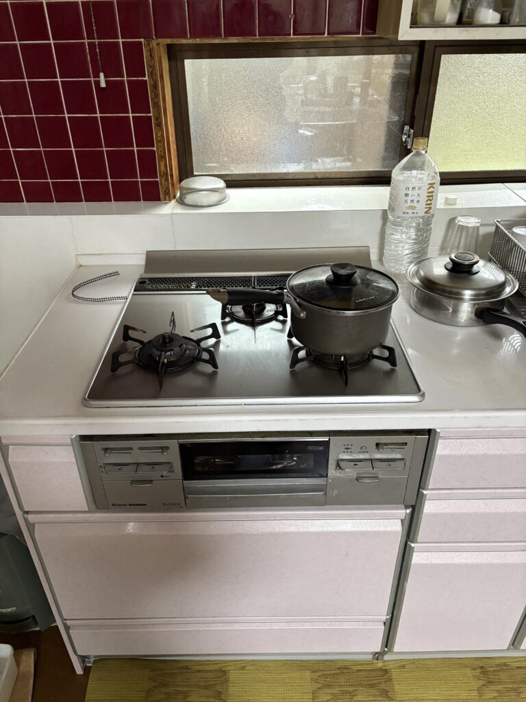 「火の付き方が悪い」とご連絡を頂き確認しに行きました。確認した結果、バーナーヘッド(火の出る部分)が破損していました。通常その部品のみの交換で終了するのですが、今回のコンロは型式が古く、部品の供給が終わっていました。お客様と相談し、本体を交換することになりました!
